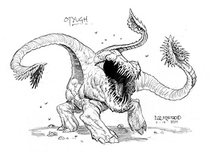 "You know what would be better than a Wand of Wonder? A Wand of Wonder GUN!" "If you had a Wand of Wonder Gun, I'd need a Wand of You Gotta Be Fuckin' Kiddin' Me!" This was an actual conversation overheard between a couple of D&D nerds, talking about the Wand of Wonder, which was basically a Wand of Doing Anything You Want Ever. This is the SERIOUS end of the D&D nerd scale. I played some D&D as a young'un, but I'd always name my characters after Transformers and I could never take it seriously, which led my brother to kill off my character all the time and make me all sad and pissy. But there was this picture in one of the monster manuals of this weird-ass thing called an "otyugh" that I always thought was funny-lookin'. I wanted to see one of those in there.